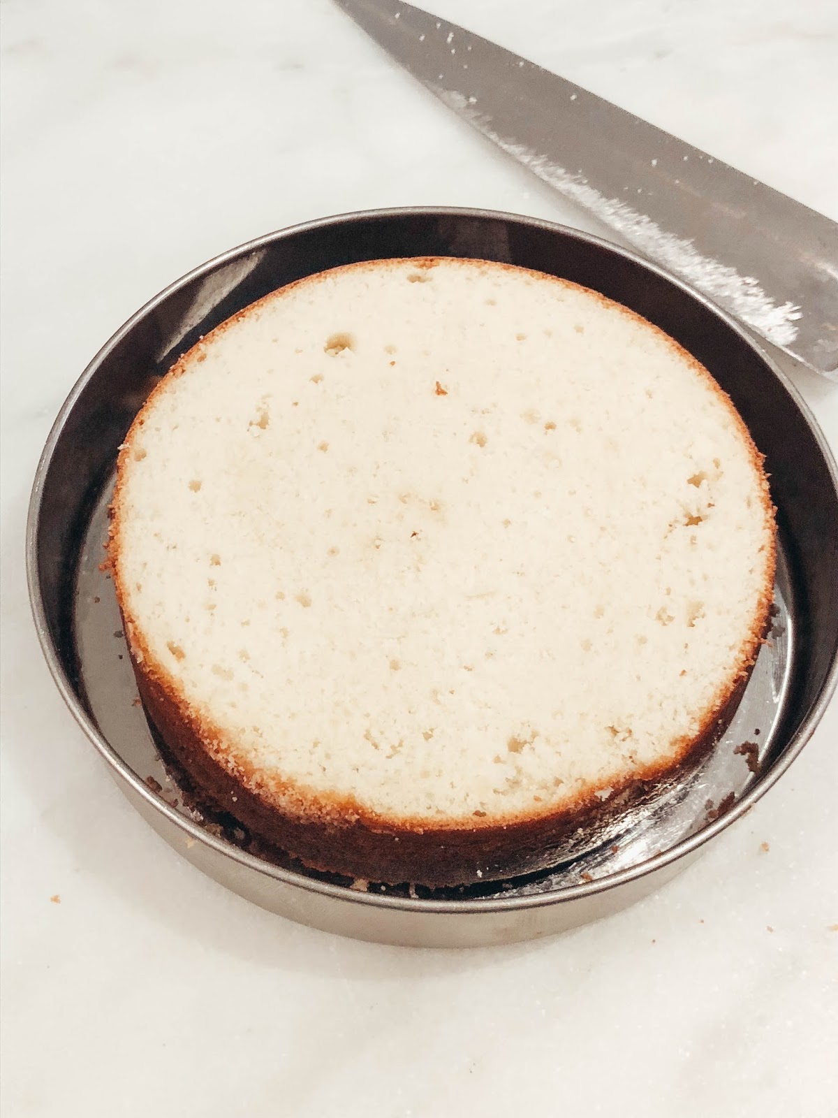 If you used the cake tin I recommended, the edges are very high, so my following method should work. You can see this in the photo below. This is just a regular old pan that is about 1 1/2 inches tall. The sponge should be taller than this pan, allowing you to take a knife, and use the cake pan as a guide, to cut the top off the sponge, allowing it to be flat and all one level. If you can’t do this, it is still possible to make sure your sponge is flat and level. Freezing your sponge makes this whole process much easier!