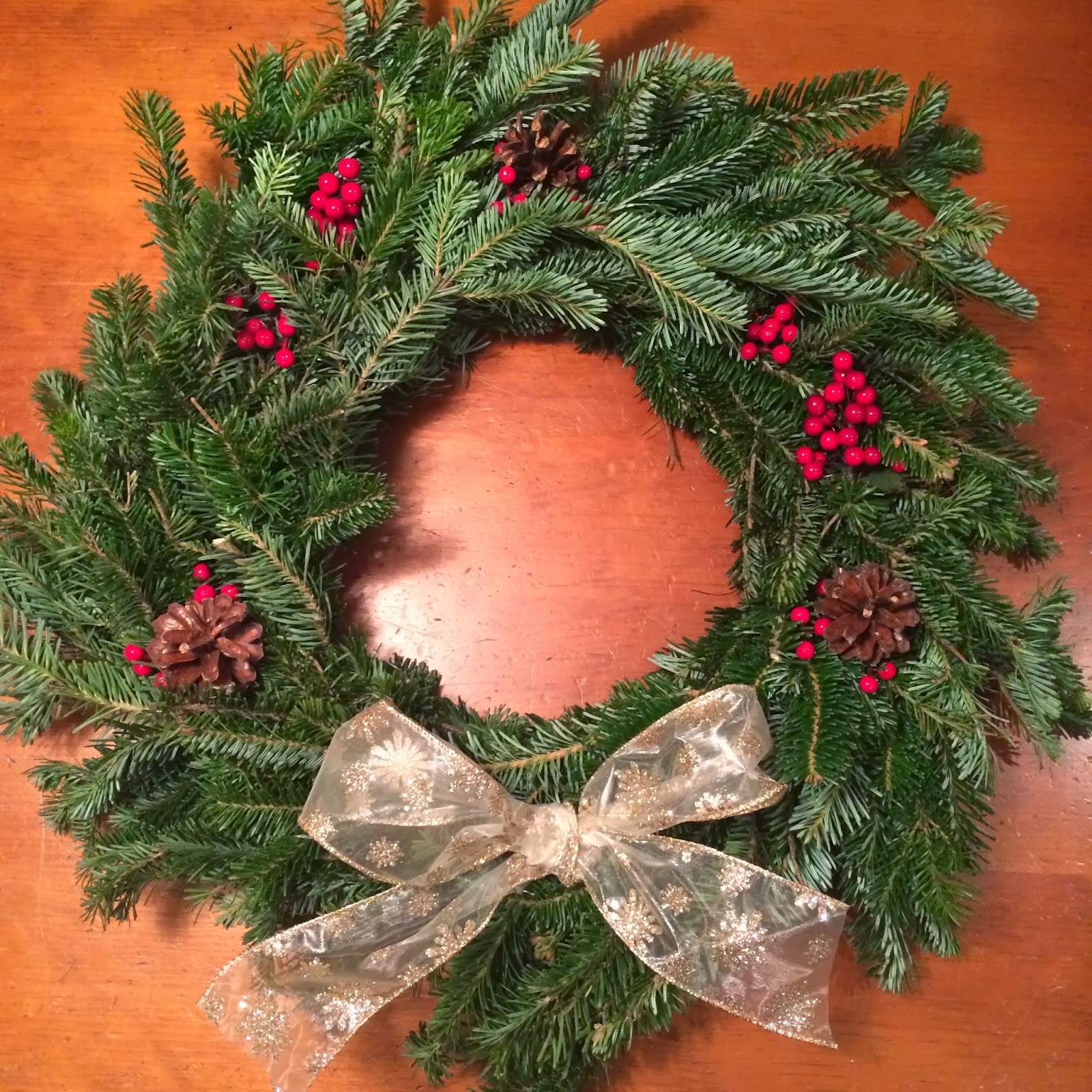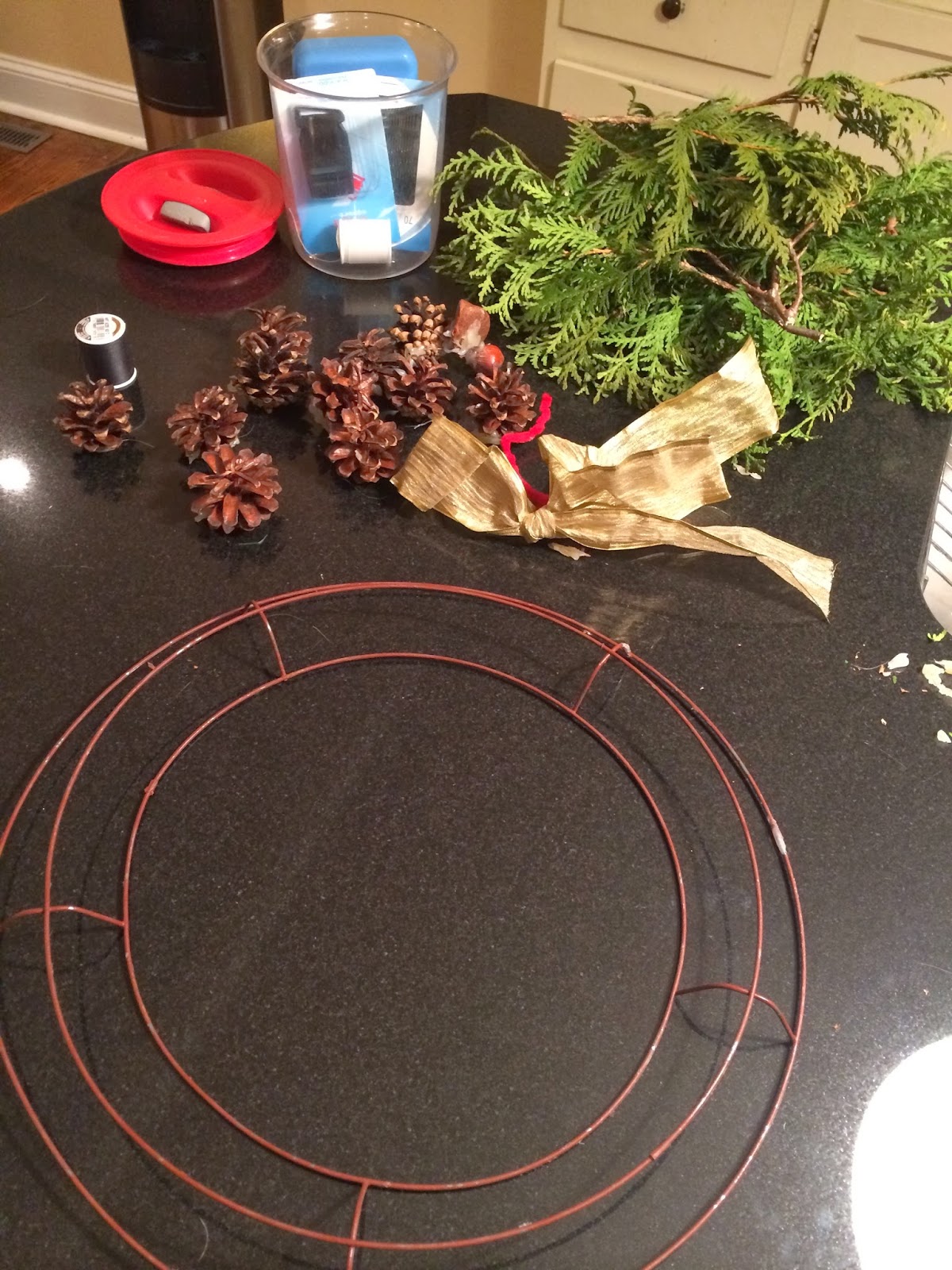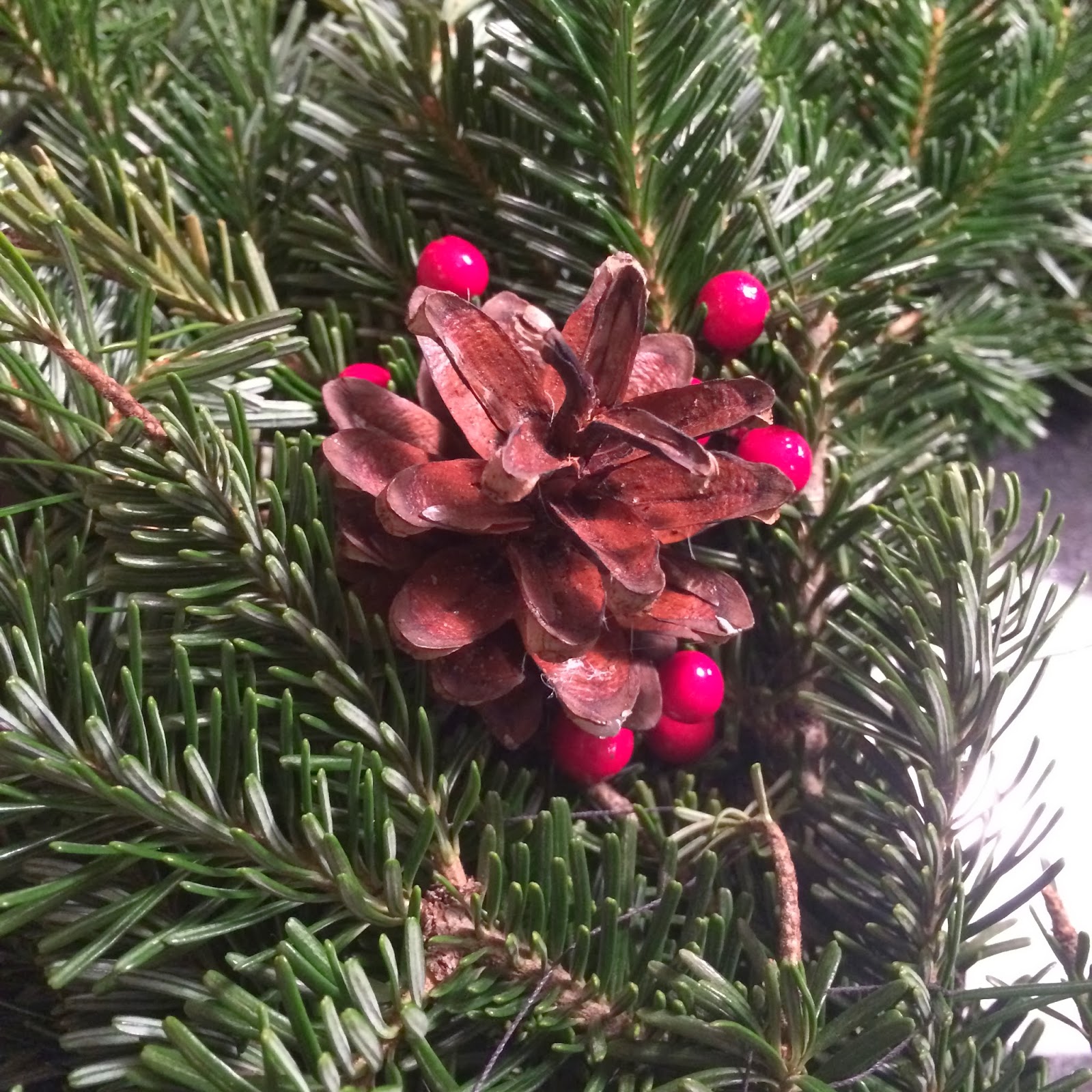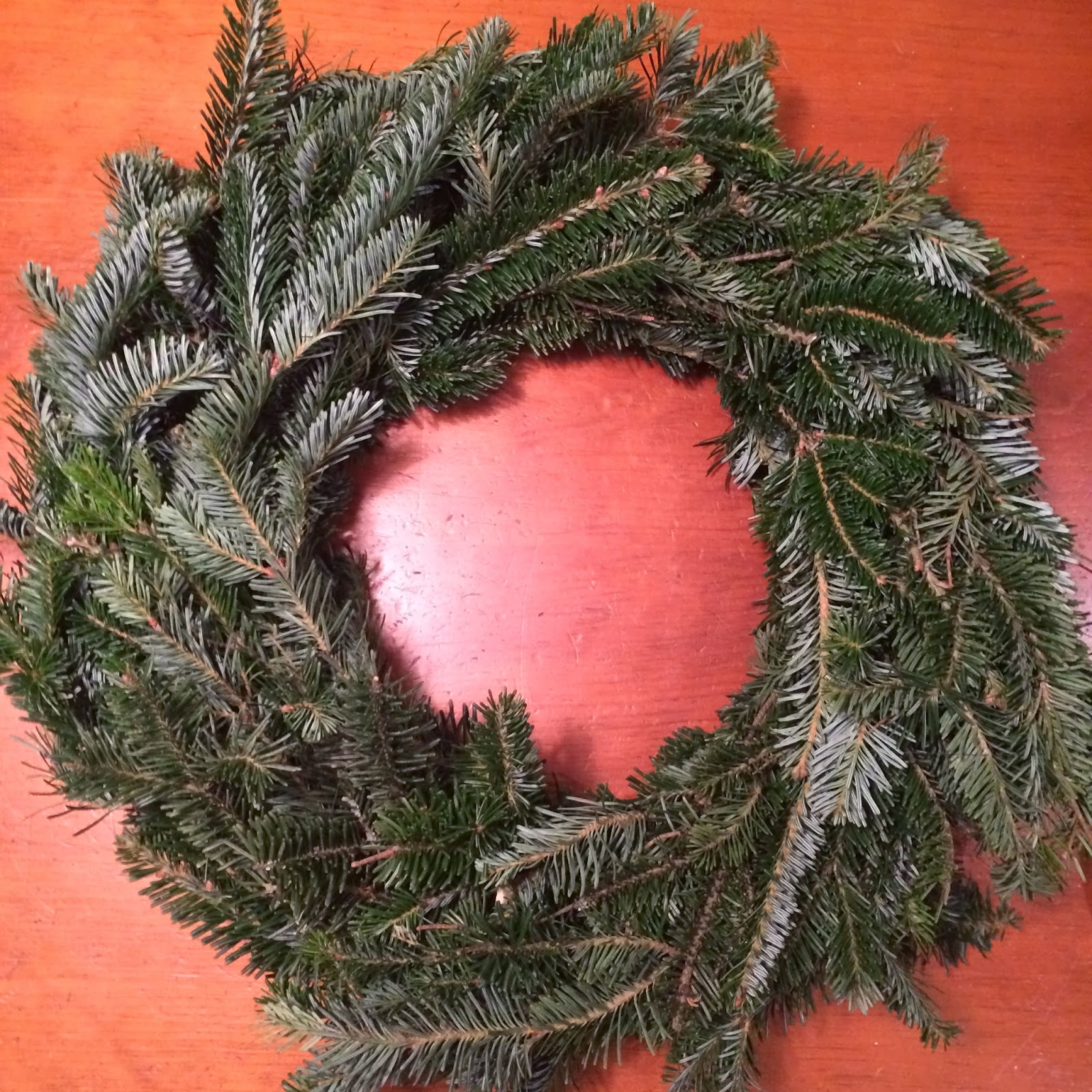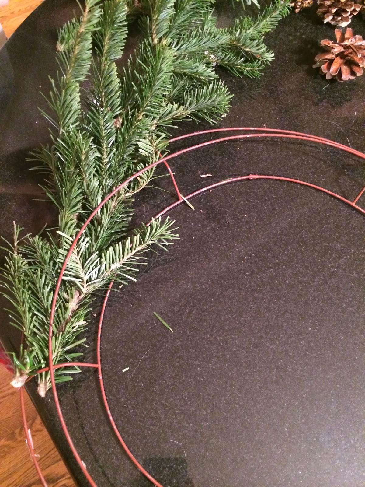 While I was home the other week, I learned how to make a Christmas wreath for the front door, out of left over pieces of Christmas tree.