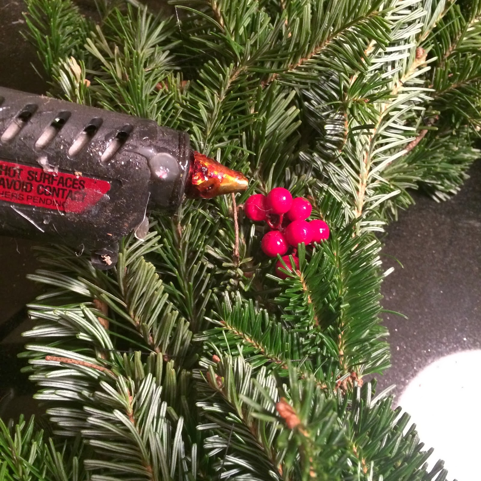 Then, I began gluing fake berries and pinecones with a hot melt glue gun.