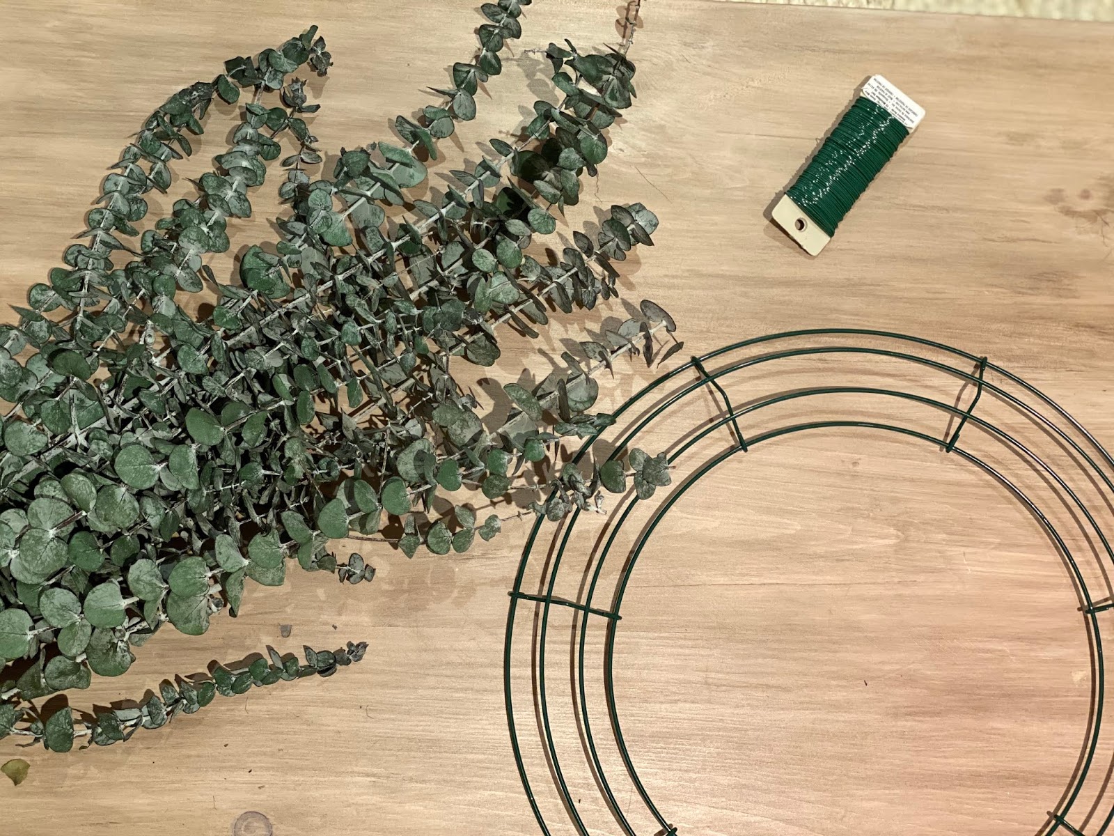 Start on the inside of the wire wreath frame. Take one piece of the Eucalyptus and one piece of floral wire. Hold the Eucalyptus onto the first layer of the wire frame and with your fingers, wind the floral wire around the end of the branch and the wire frame. You can start at any point of the first level of the wire wreath frame. See the photo below.